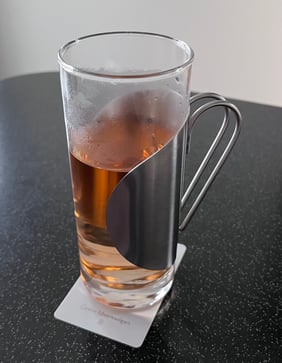 Geschützt durch einen dicken Glasboden (ca. 1 cm) geht es auch mit einem Teeglas. Fühle nach dem Eingießen des heißen Tees vorsichtig mit der Hand, ob sich der Glasboden schmerzfrei anfassen lässt, sonst etwas abkühlen lassen.